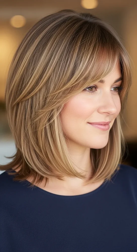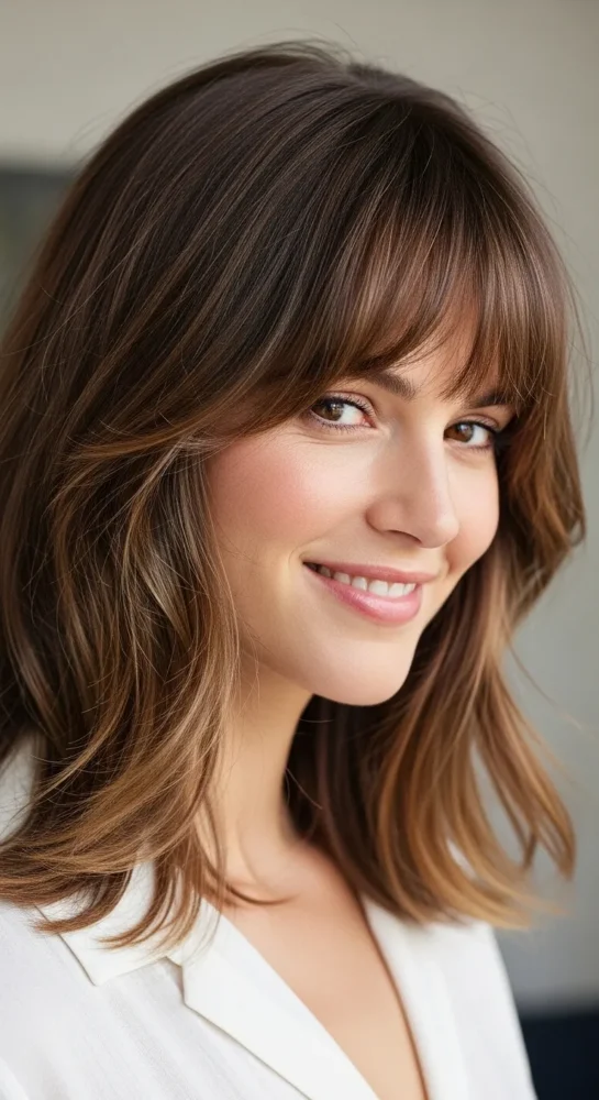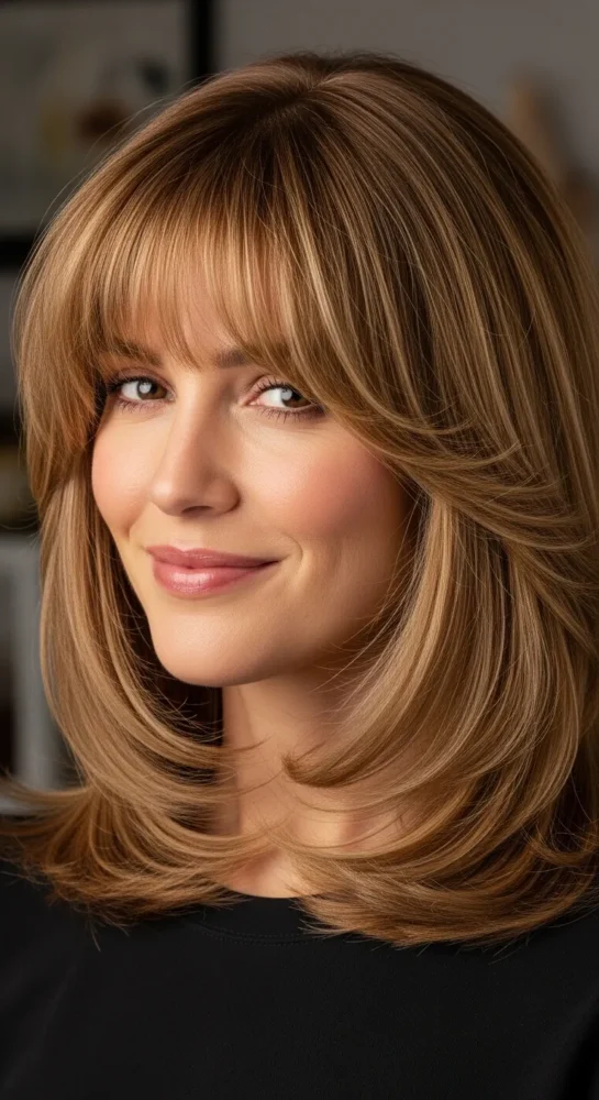 The right bangs can frame your face, hide thinning areas, and add softness, while medium-length cuts keep styling simple and versatile.