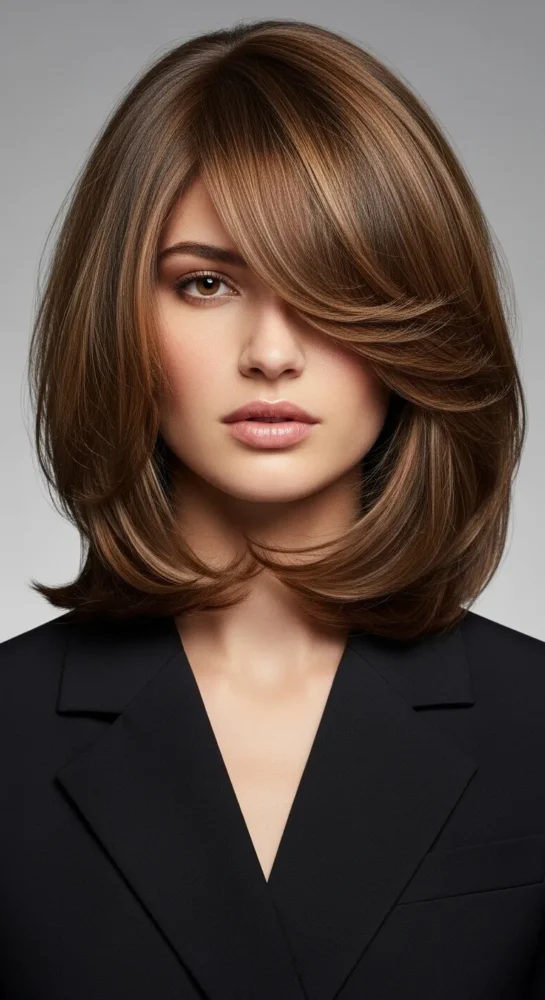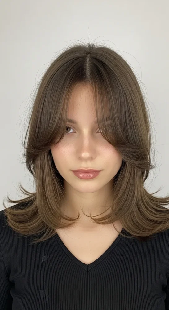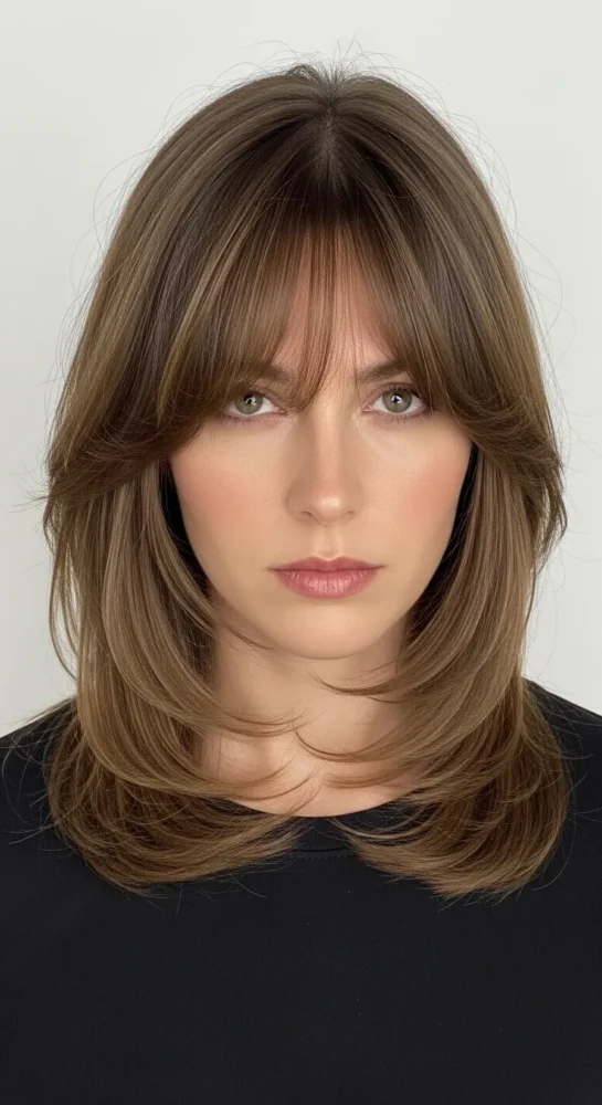 Feathered bangs are light, airy, and perfect for thin hair. Combined with layers, they create softness and movement while keeping the haircut youthful and flattering.