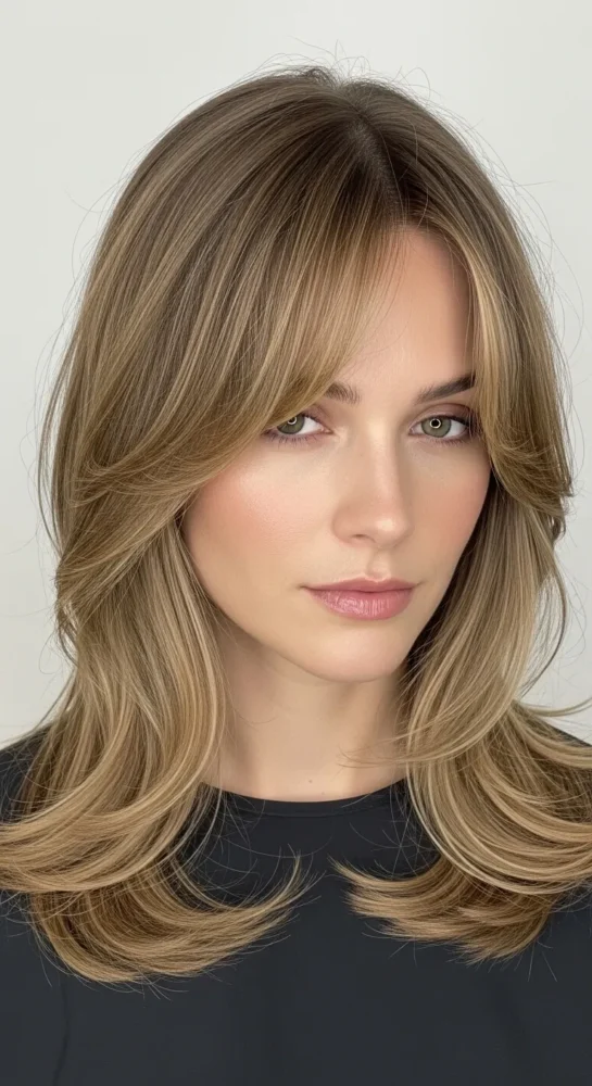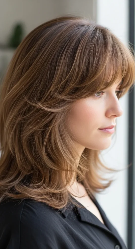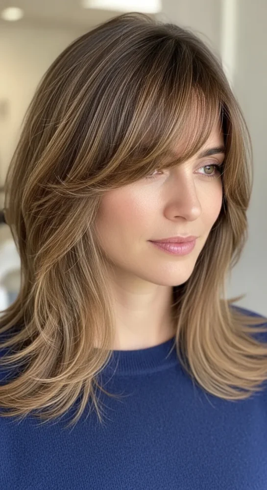 Long bangs that blend into layers help thin hair look fuller without over-layering. This style works well if you like styling with a round brush or light waves for extra lift.