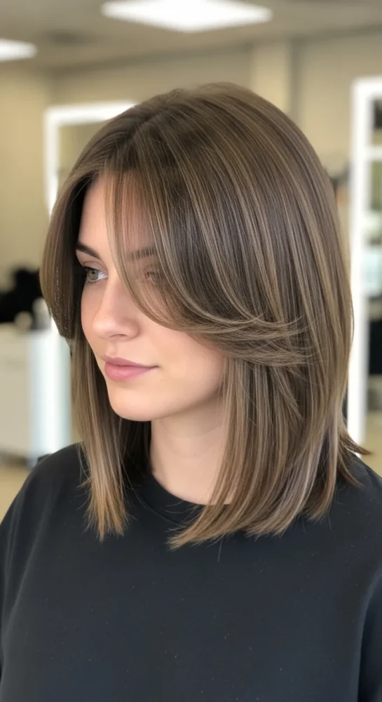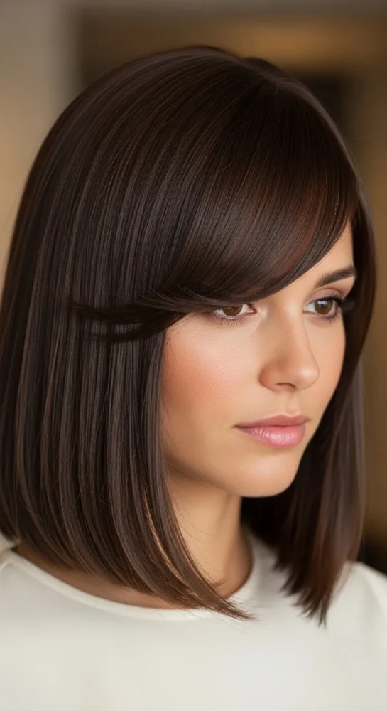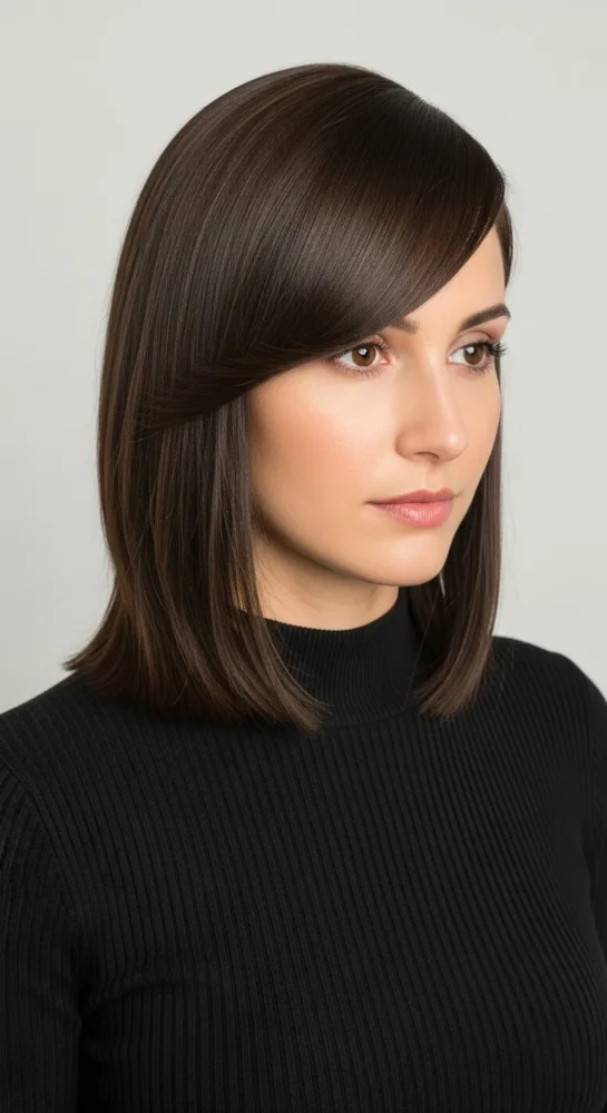 This cut keeps everything sleek while adding interest through side bangs. It’s a great choice for thin hair that struggles with volume because the structure itself creates fullness.