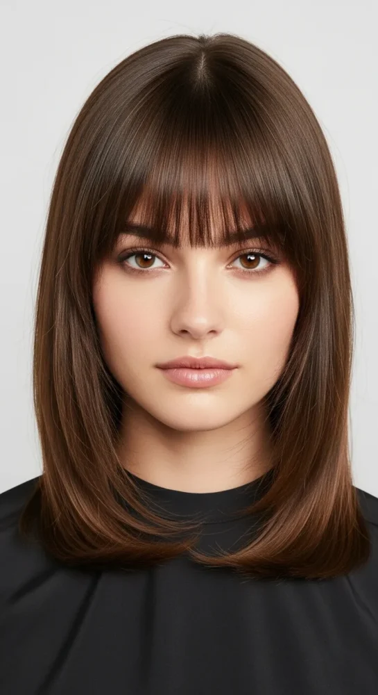 Wispy bangs are a thin-hair favorite because they don’t remove bulk. Paired with straight medium-length hair, they soften the face while keeping the overall look light and airy instead of heavy or flat.