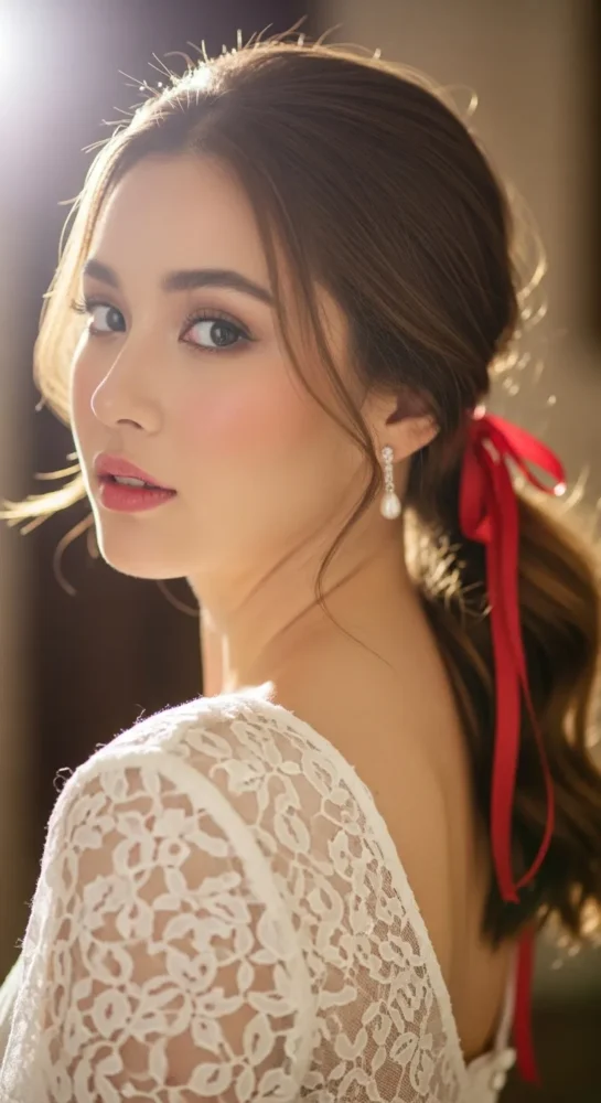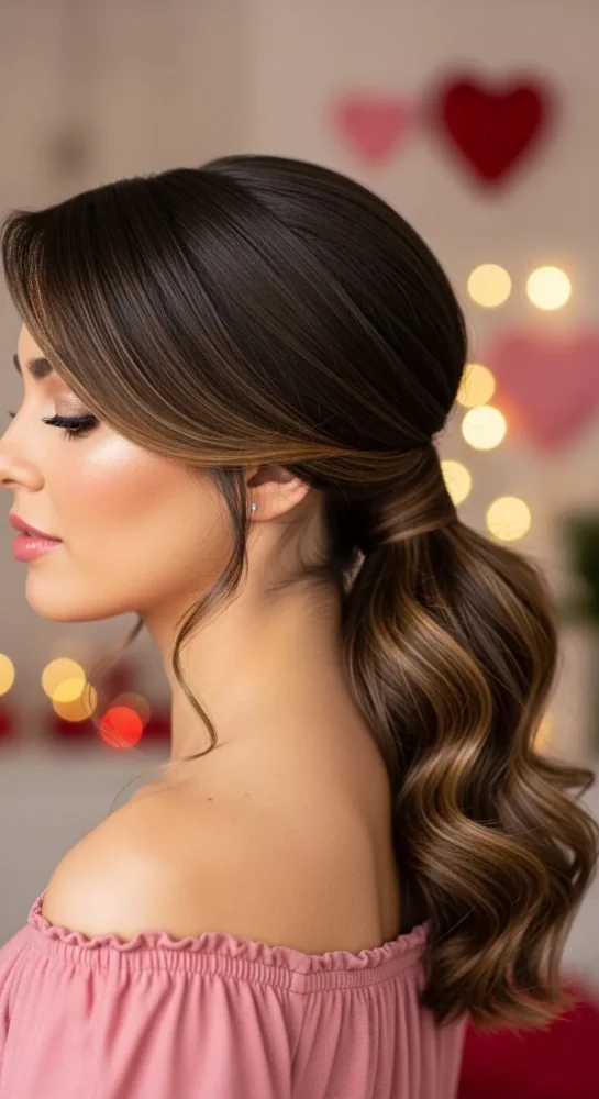 Adding a ribbon transforms a simple ponytail into a Valentine’s Day statement. Choose red, blush, or satin textures for a romantic finish.