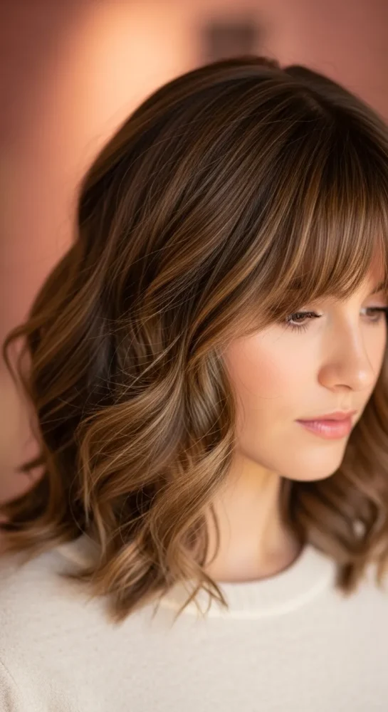Wispy bangs paired with loose curls create a sweet, flirty hairstyle that photographs beautifully. This look works especially well for dinner dates or evening plans when you want something romantic but not heavy.