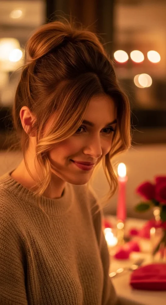 This half-up bun is playful yet stylish—perfect if you want something casual but still date-worthy. Leave a few strands loose around the face to soften the look and add effortless charm.