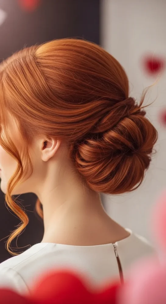 A red hair updo instantly stands out and feels bold yet romantic. Keep the texture soft and slightly undone so the style feels modern rather than formal.