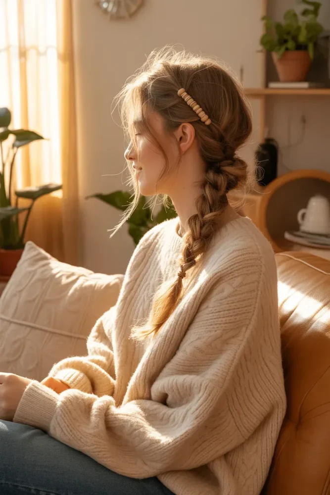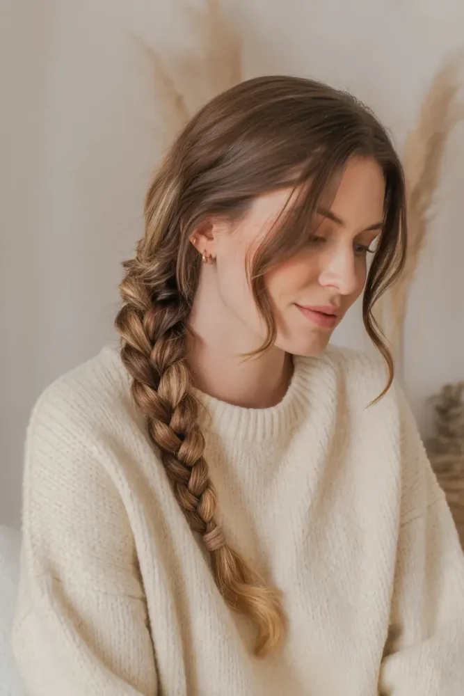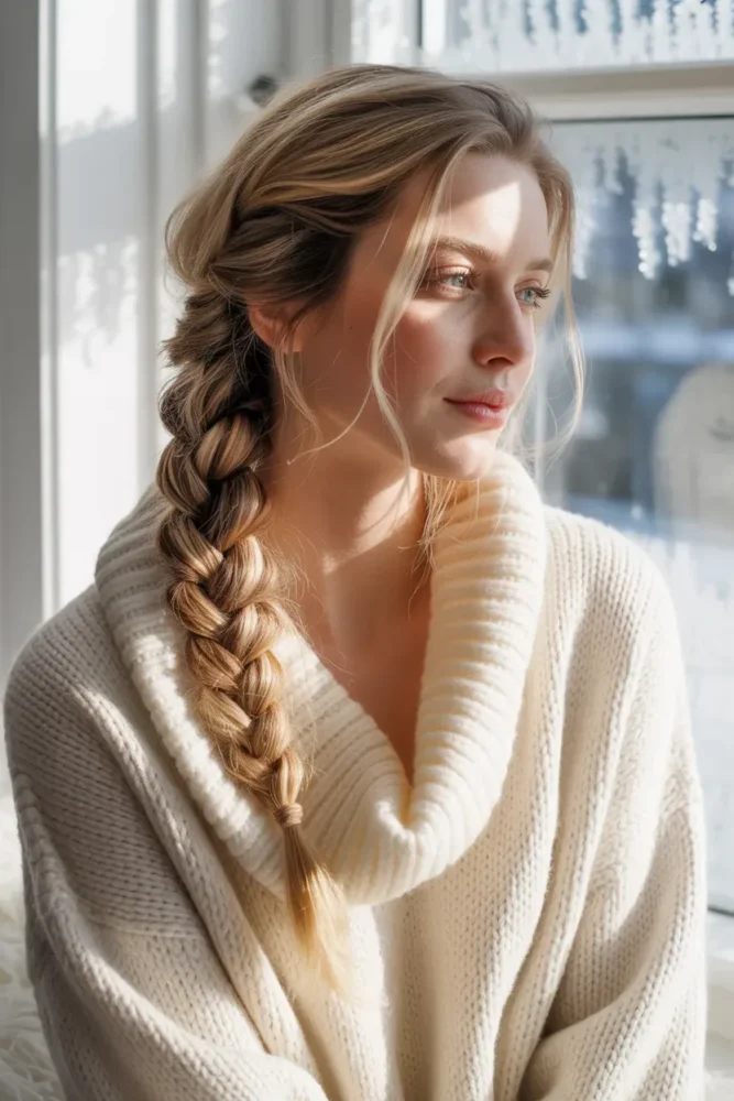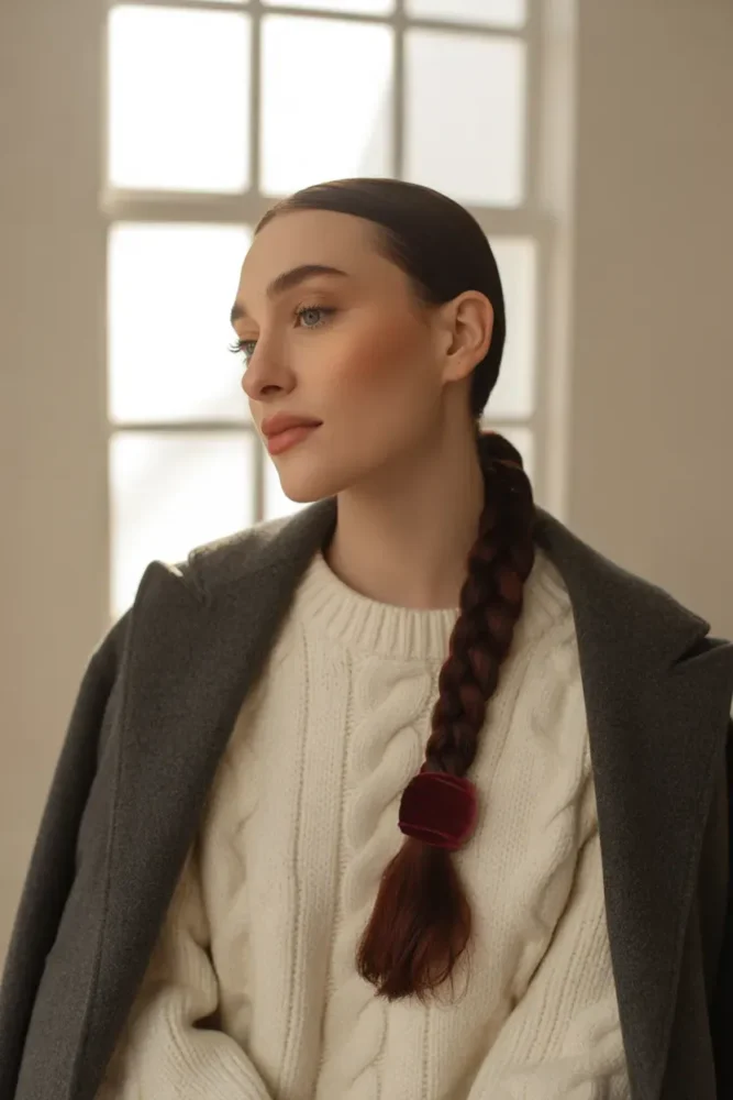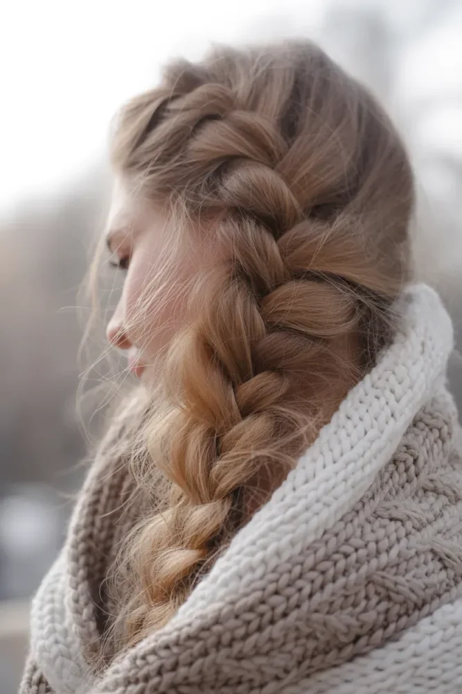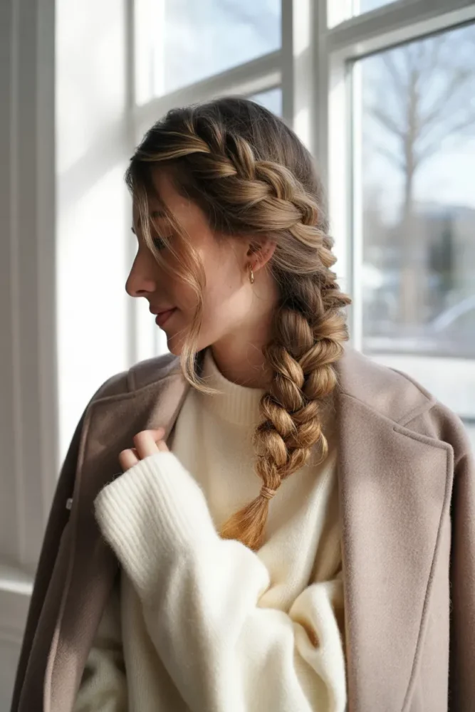 A timeless Winter Hair Braid that never fails. This relaxed braid looks soft, feminine, and effortless, especially when paired with chunky knits.