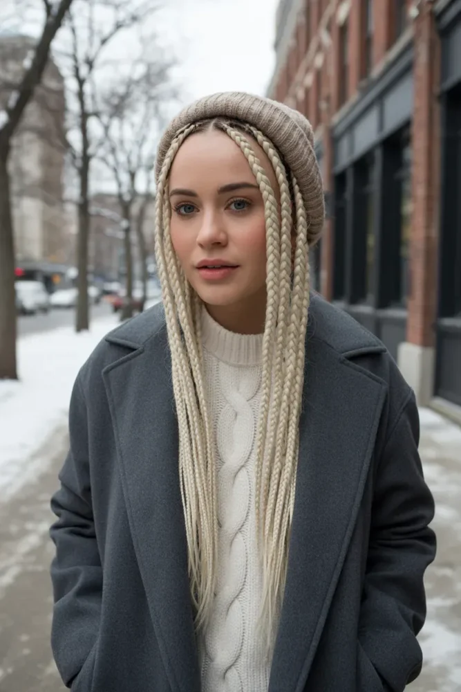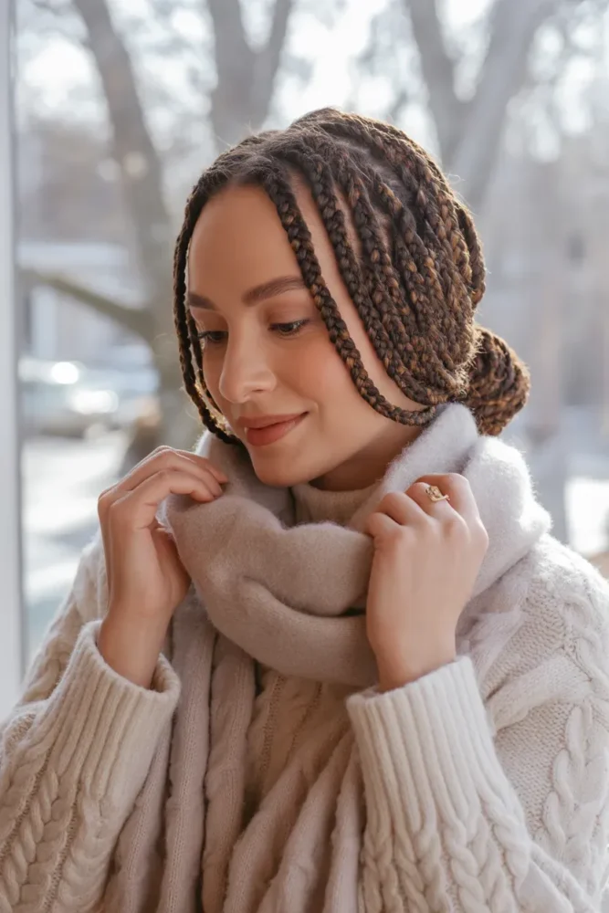 Box braids styled into buns or ponytails are ideal for winter hair health.