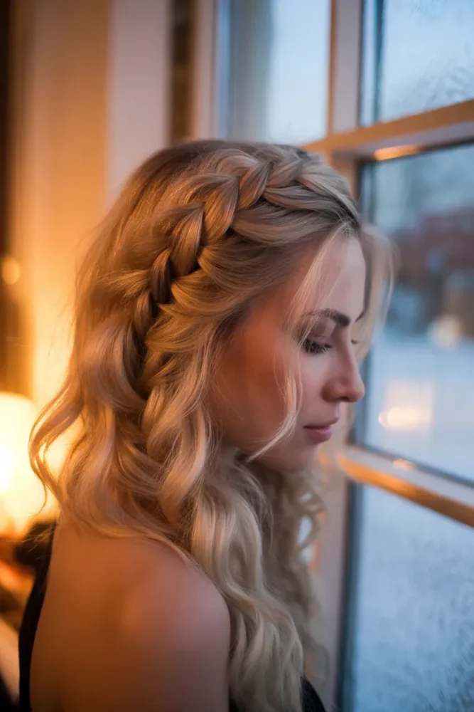 Soft waves combined with a waterfall braid create a romantic winter look.