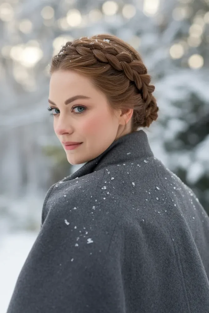 Milkmaid braids are both practical and elegant. They keep hair completely secure and reduce friction from winter layers.