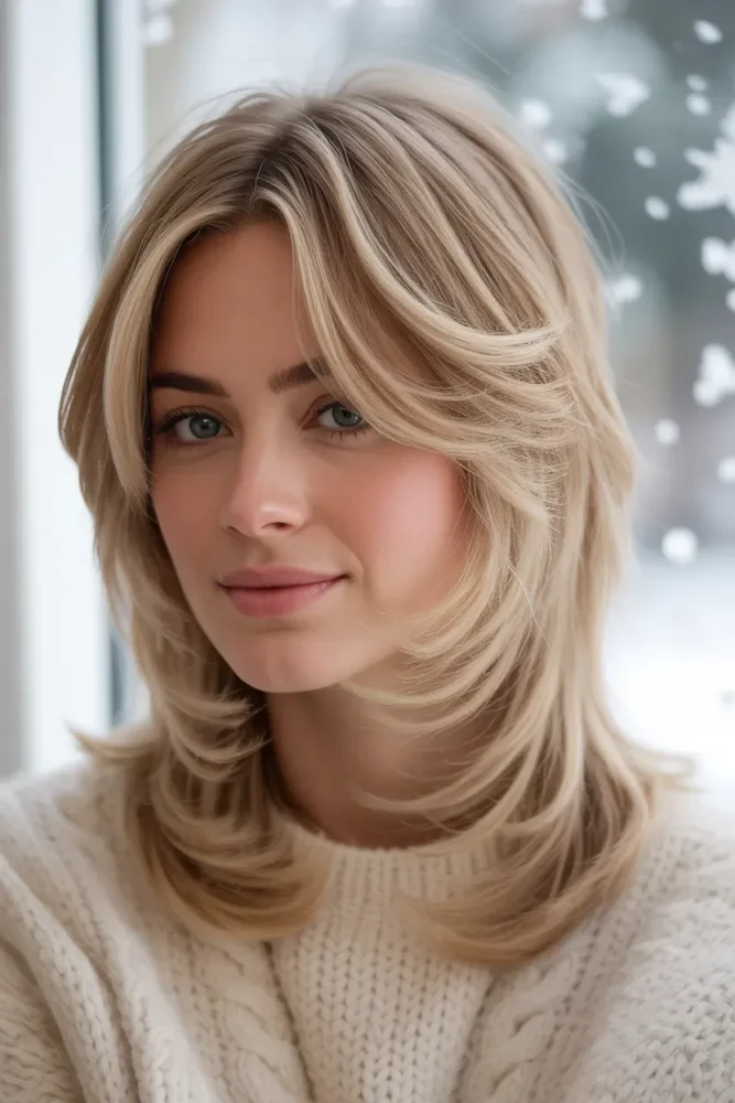 Sandy butter blonde feels soft, wearable, and flattering during winter months.