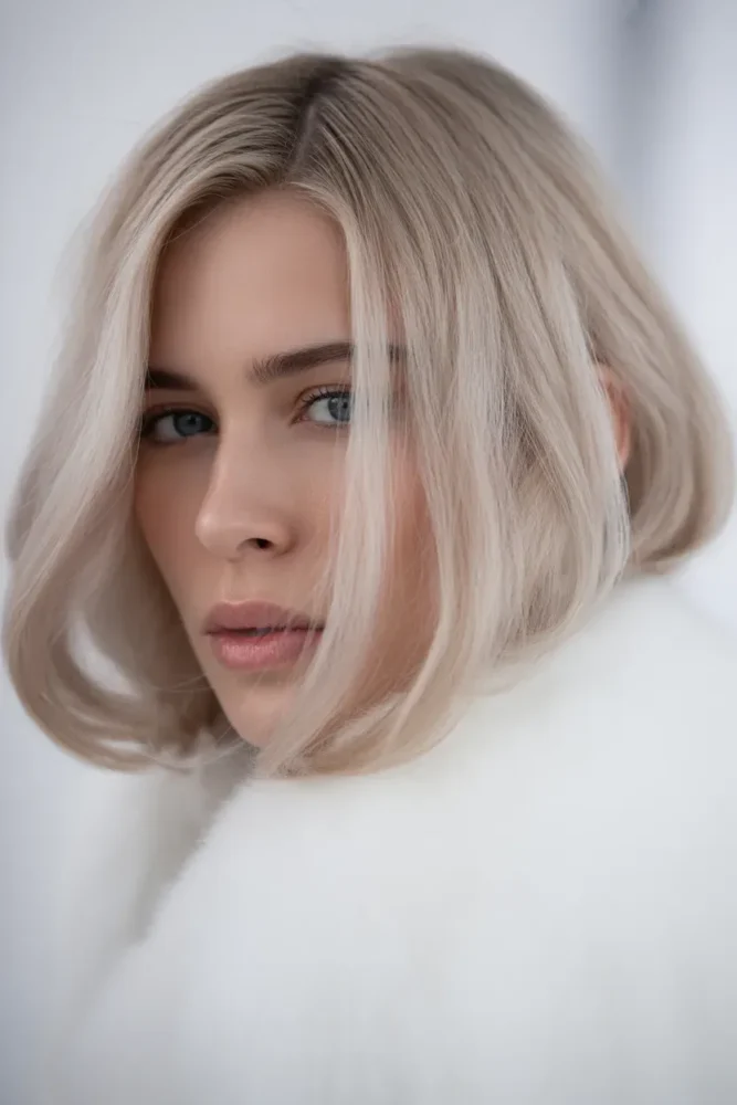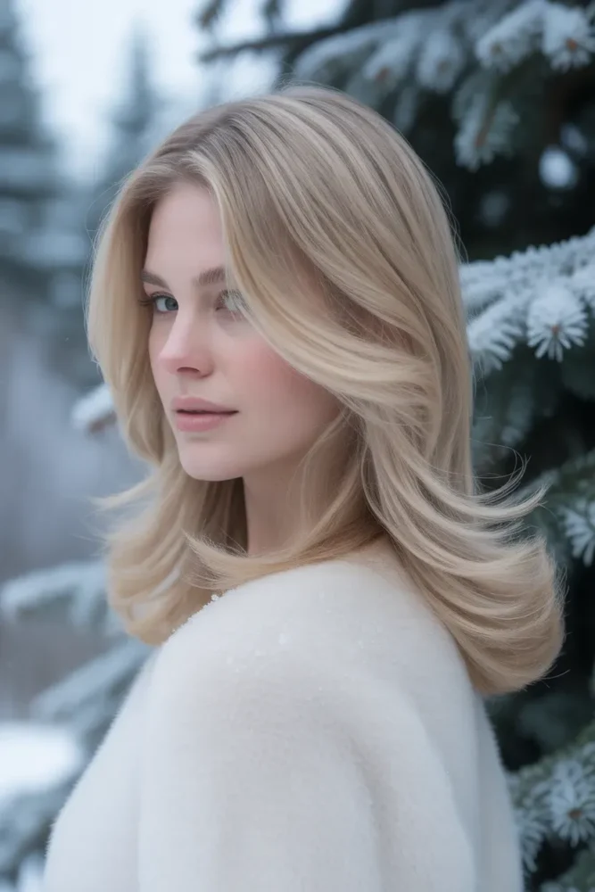 Icy beige blonde balances cool and neutral tones for a refined winter look.