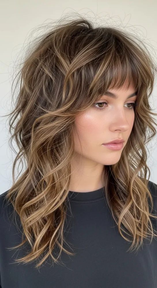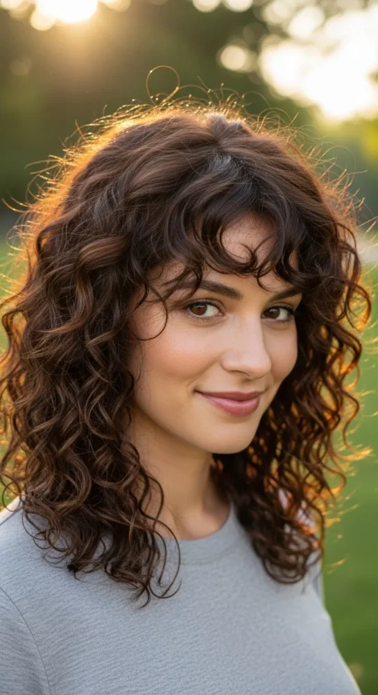 A modern shag adds texture without chaos. Strategic layers create movement while keeping curls light and airy.