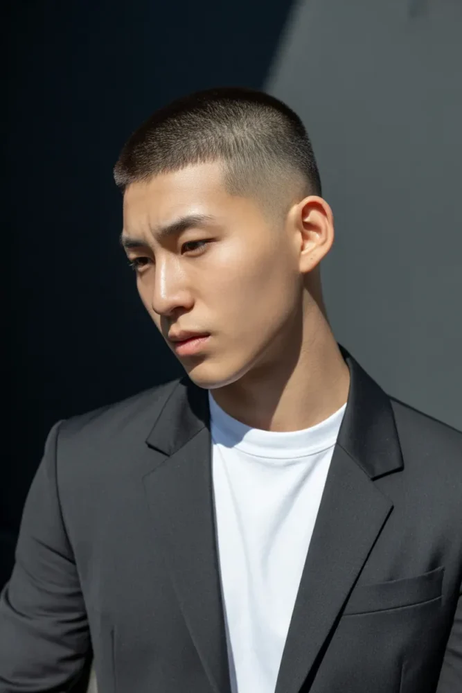 A buzz cut with fade emphasizes strong facial features by removing distractions.