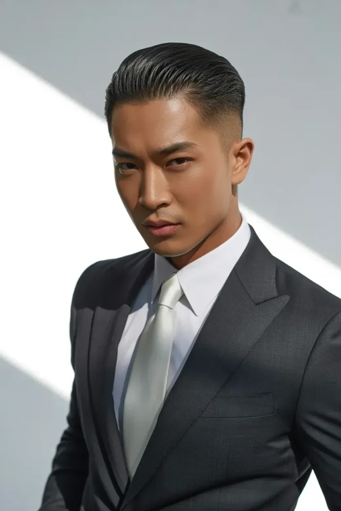 The slick back undercut sharpens angular faces by emphasizing clean lines and strong contours.
