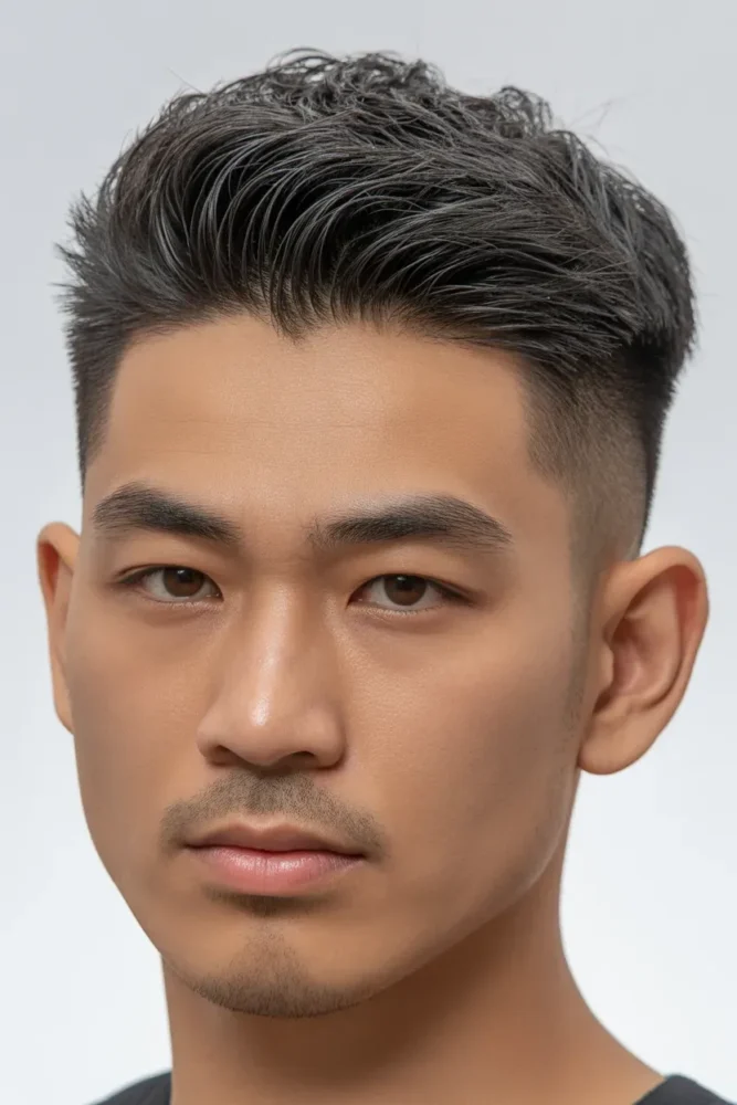 This hairstyle is great for men seeking an energetic, sporty look that subtly reshapes facial appearance.