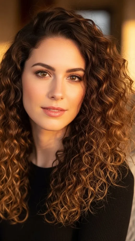 Soft curls paired with caramel highlights create a romantic, feminine look.