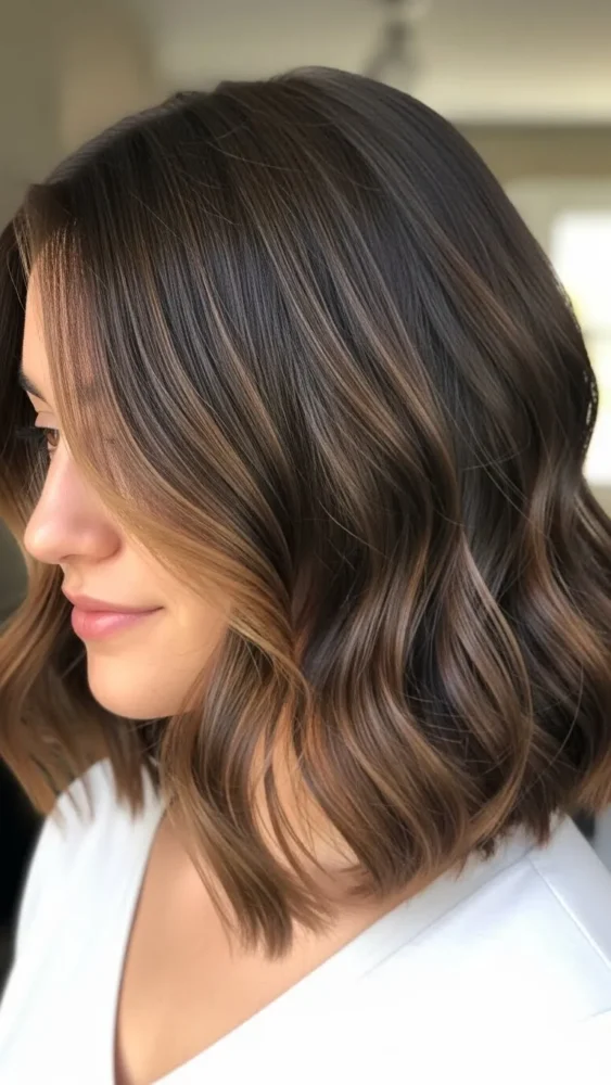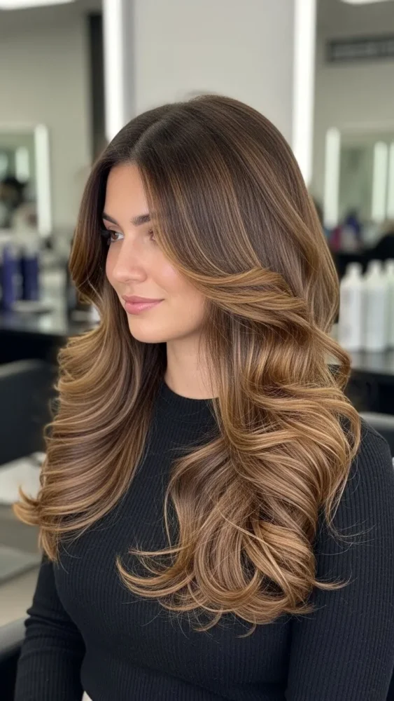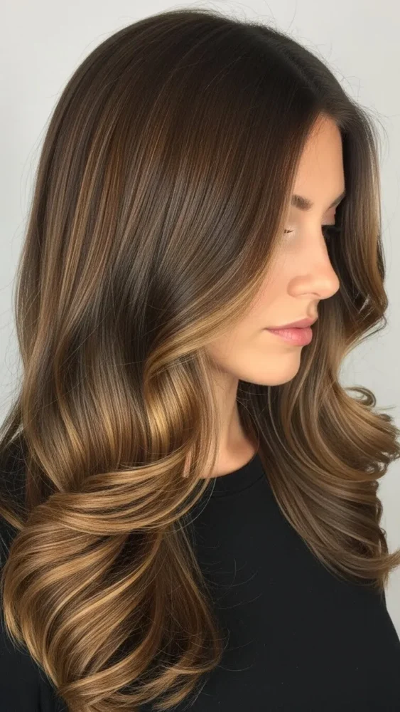 Caramel balayage on brown hair adds warmth and dimension while avoiding harsh lines.