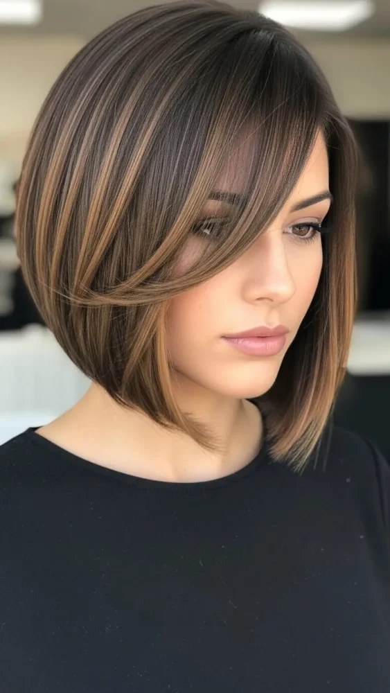 A bob haircut becomes more playful with caramel highlights.