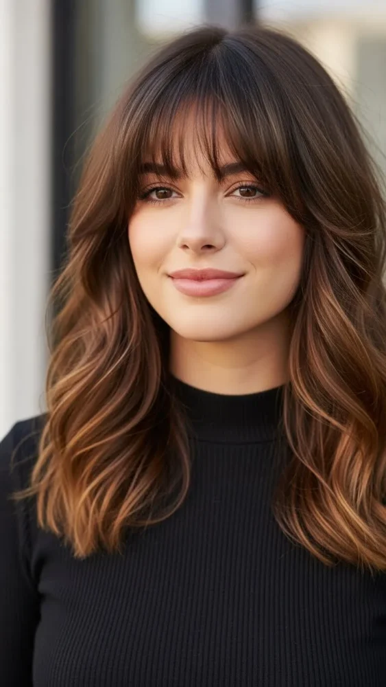 Curtain bangs paired with caramel highlights frame the face beautifully.
