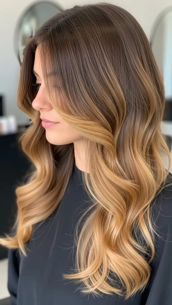 Caramel ombre transitions gradually from brown roots to warm caramel ends.