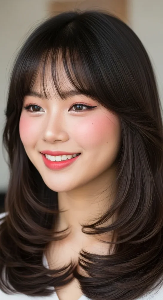 This style is perfect if you love long hair but want movement. The layers prevent the hair from looking flat, while the bangs add a trendy Korean touch.