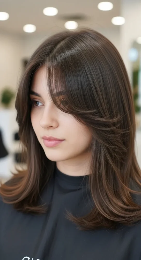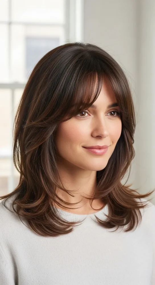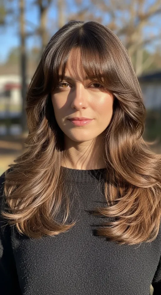 Rich chocolate brown enhances layered haircuts beautifully. The layers catch the light, adding depth and shine, while curtain bangs soften the overall look.
