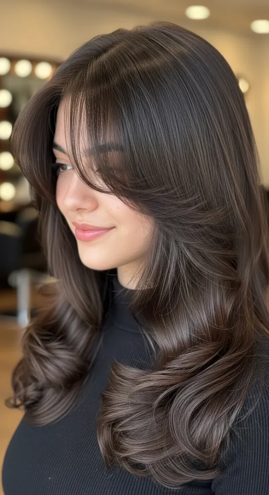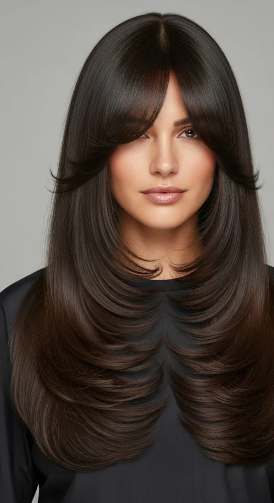 Dark brown shades make layered cuts look rich and healthy. This style feels polished and modern, especially when paired with softly parted curtain bangs.