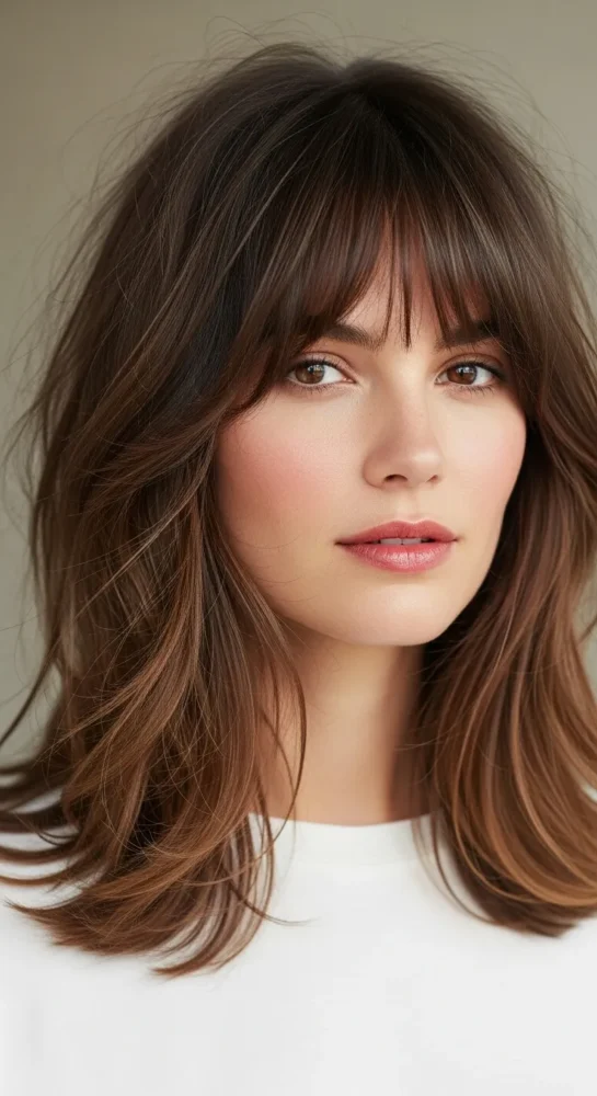This look is all about texture. The layers enhance natural waves, and the bangs frame the face gently, creating a relaxed yet stylish vibe.