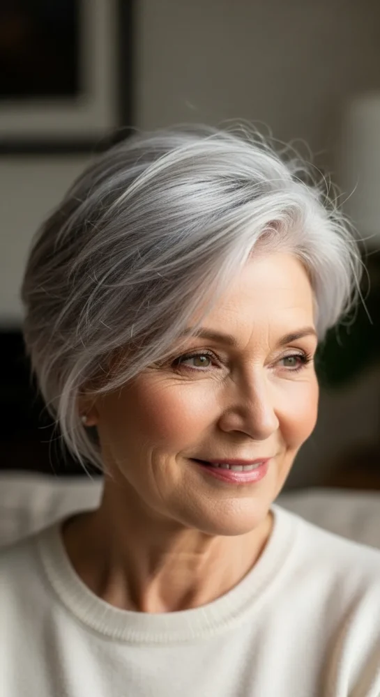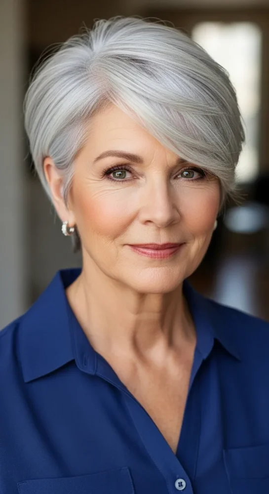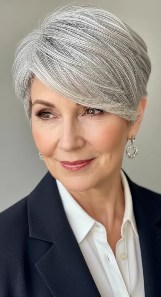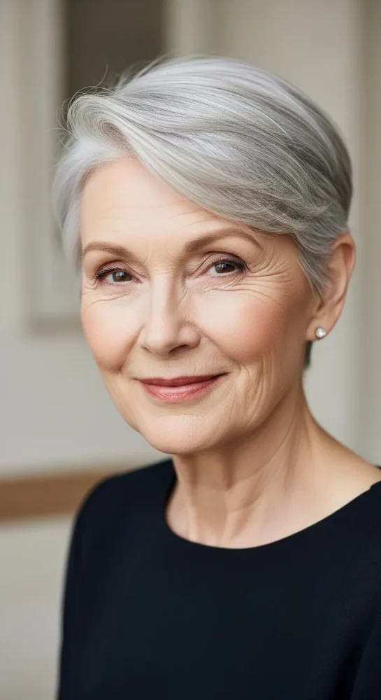 A longer fringe swept to one side instantly softens the face. This style balances sharp features and adds movement, making it one of the most flattering pixie hairstyles for older women.