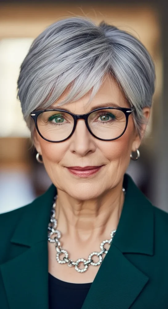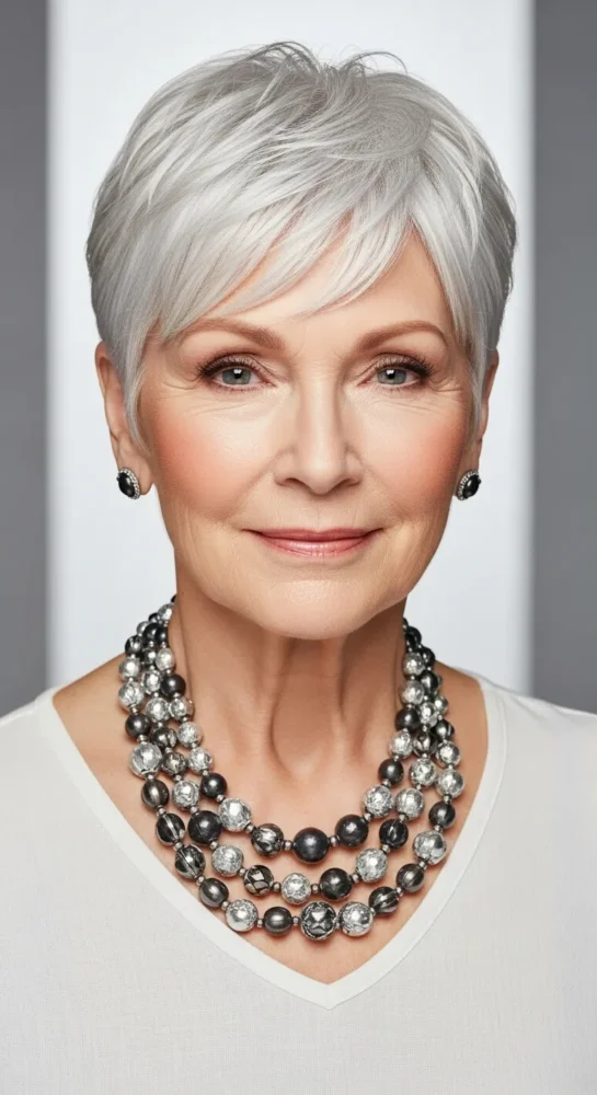 This close-cropped pixie feels bold yet refined. Perfect for women who love minimal styling and maximum impact. It highlights cheekbones and gives short grey hair a confident, fashion-forward edge.