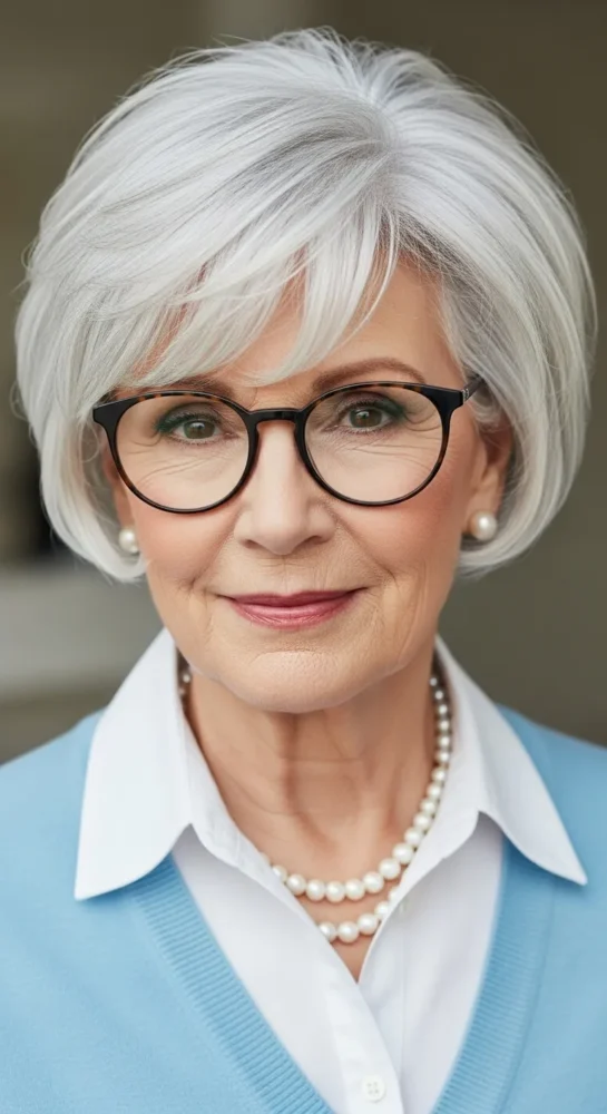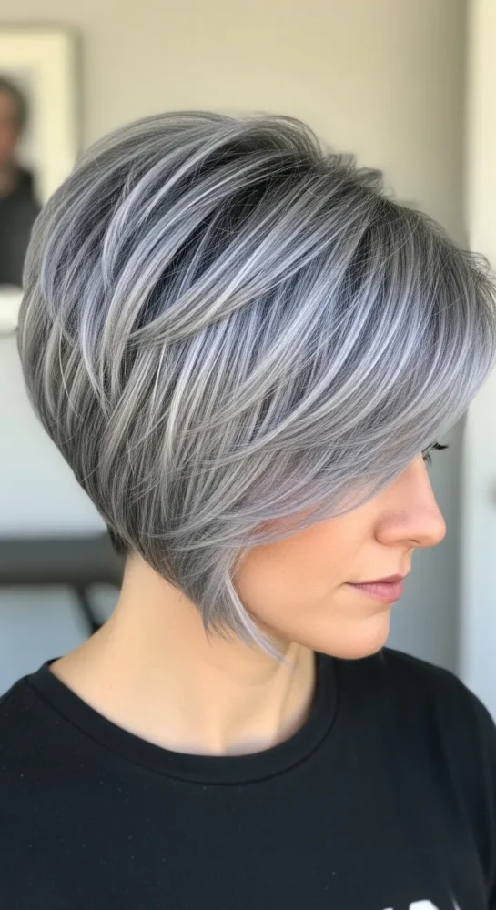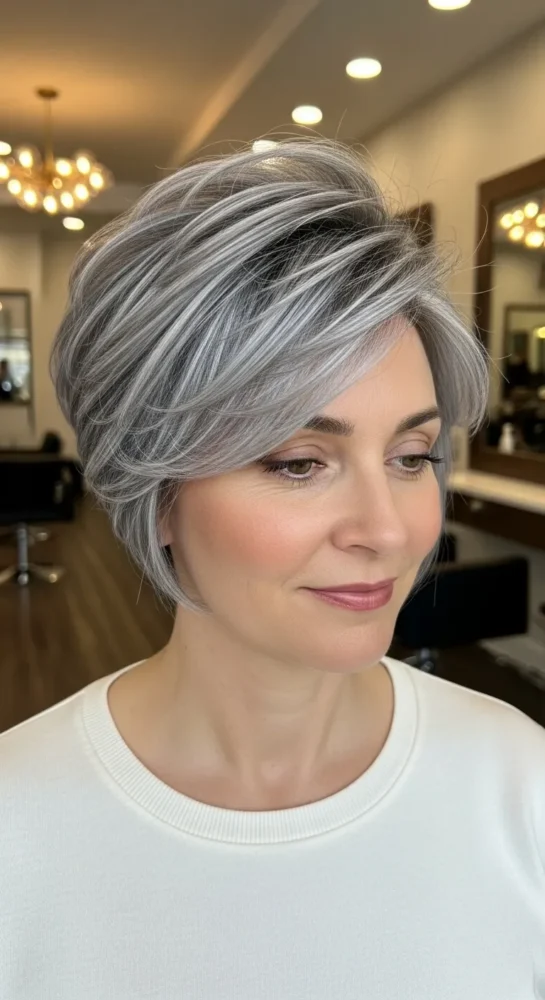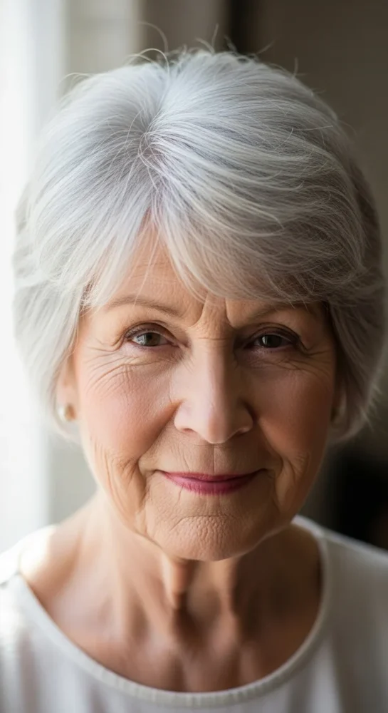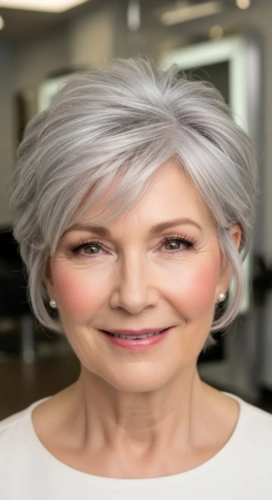 A softly layered pixie adds movement and lightness to short grey hair. This style works beautifully for women who want volume at the crown without sharp edges. It’s polished enough for everyday wear and effortless to style.