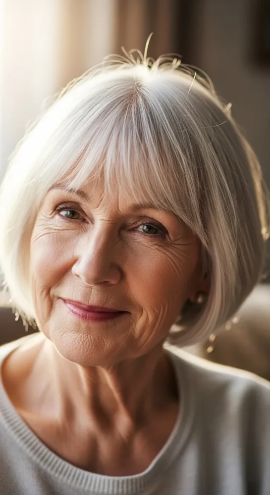 Wispy bangs gently frame the forehead and soften fine lines. This pixie works beautifully if you want coverage without heavy fringe, especially with white or silver hair.