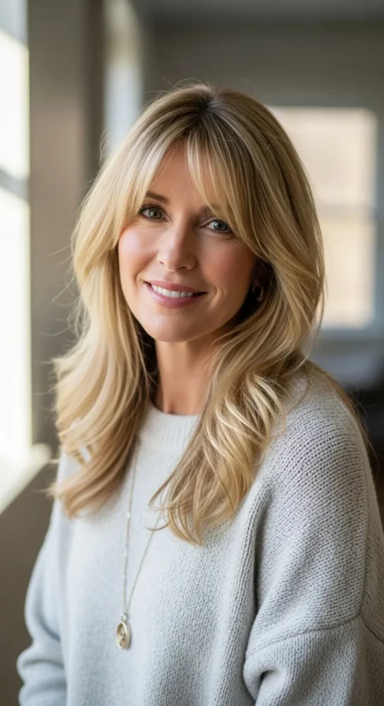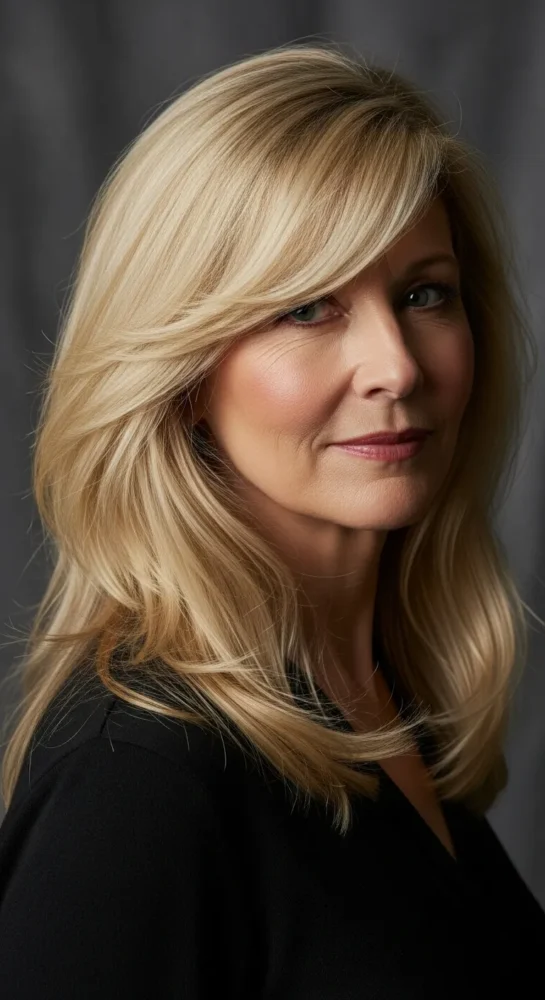 Side-swept bangs are timeless and flattering, especially for women over 40. They add interest to long blonde hairstyles while drawing attention away from fine lines around the eyes and forehead.