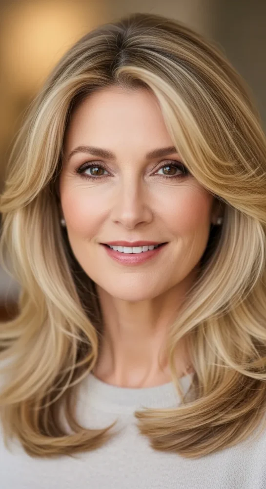 Warm honey blonde shades add softness and warmth to mature skin tones. This long hairstyle feels inviting, healthy, and natural, making it a popular choice for women over 40.