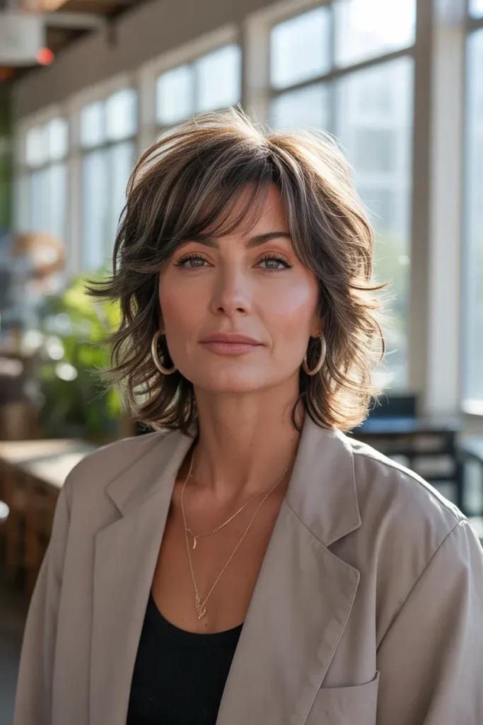 The textured shag cut adds volume, body, and playful movement for women over 40.