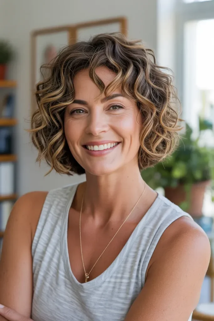 A curly bob with highlights enhances volume and movement, giving women over 40 a fresh, youthful look.