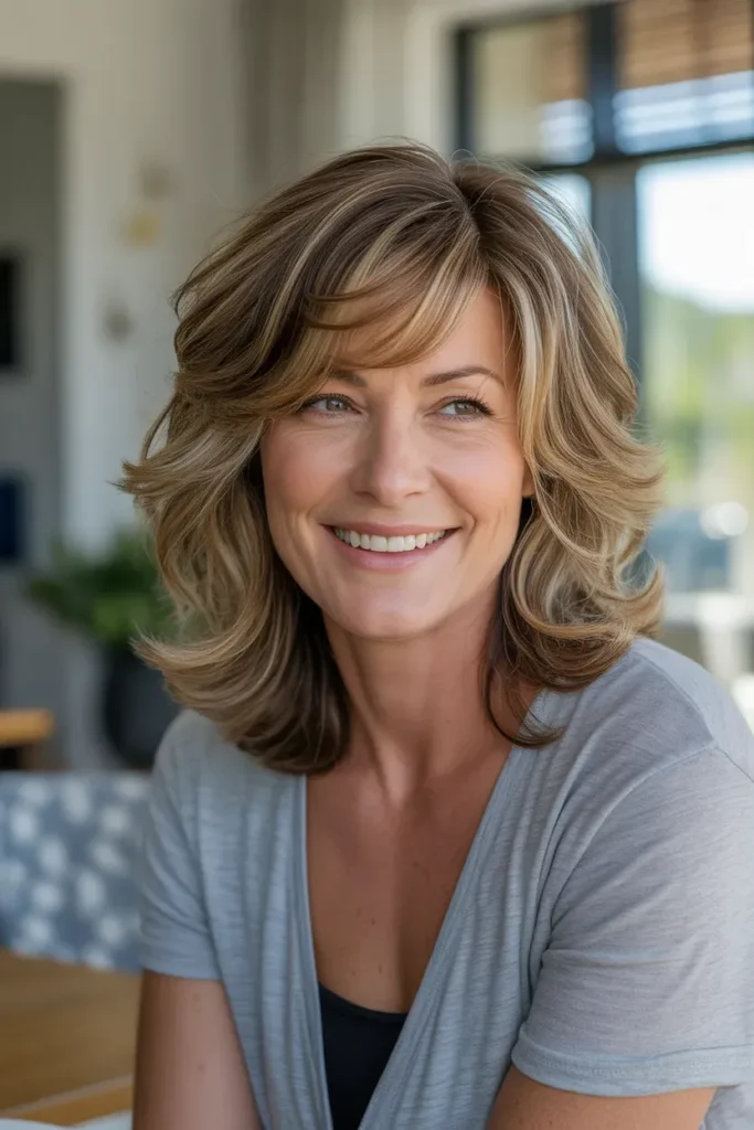 Side-swept bangs with layers soften facial features and add a modern touch for women over 40.