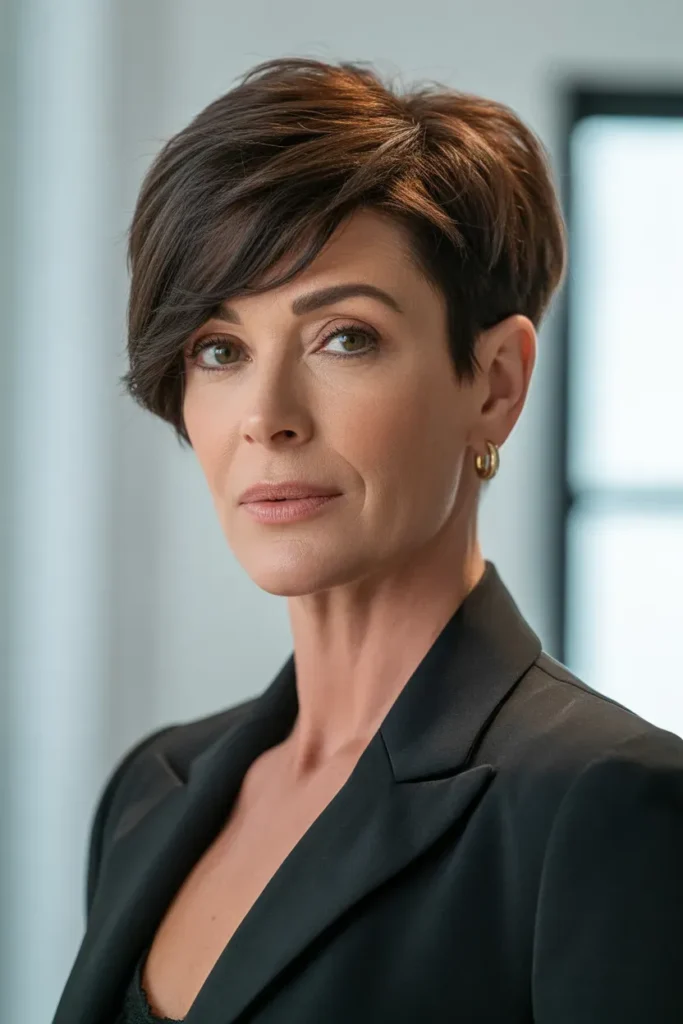 The classic pixie cut is perfect for women over 40 who want low-maintenance yet stylish hair.