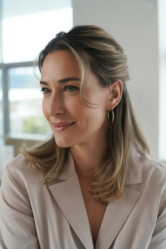 This versatile hairstyle adds movement without heaviness and frames the face elegantly.