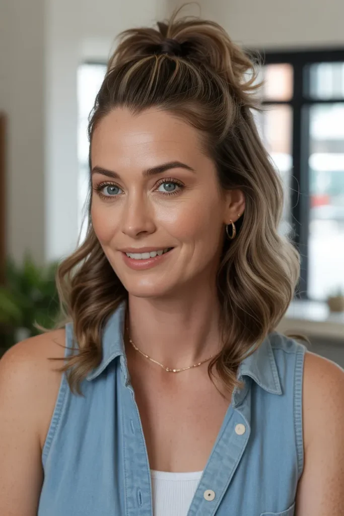The half-up ponytail adds playful volume and keeps hair out of the face.