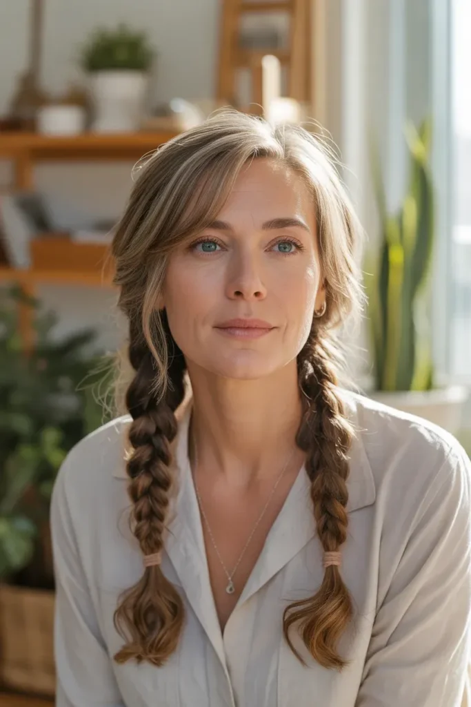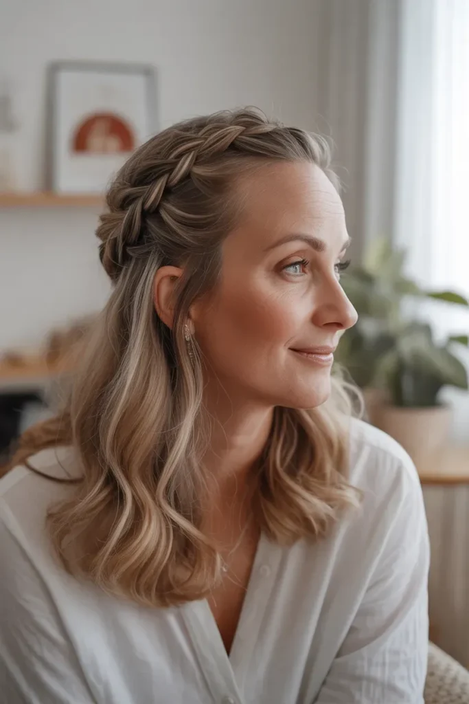 The braided crown half-up hairstyle is elegant and fun, perfect for women over 40.