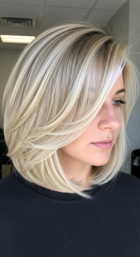Blonde tones paired with feathered layers create dimension and lift. The layers catch the light beautifully, making hair look fuller. This style works especially well with highlights or balayage.